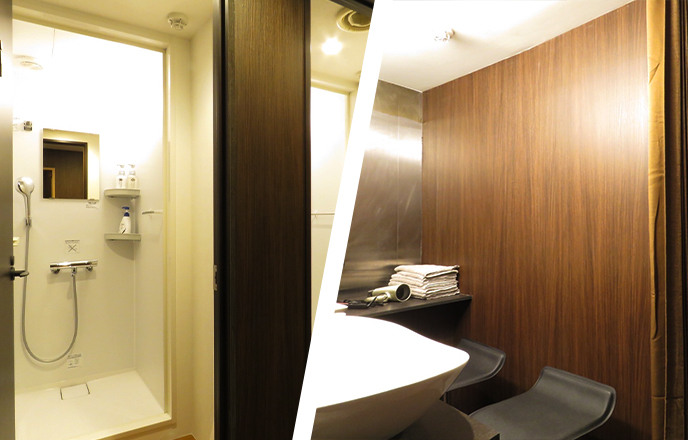 男性・女性用それぞれ2室ずつのシャワールームがあり、待ち時間なくストレスフリーです。シャワー後はメイクルームですっきりして頂けます。男性・女性用それぞれ1室ずつあり、ドライヤー・綿棒・化粧水・コットン等のアメニティなどもご用意しております。